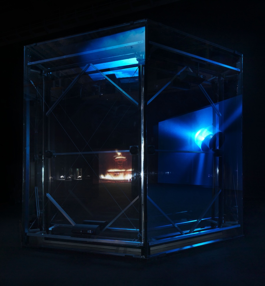 法瑞藝術家朱利安・沙裡埃的個展「午夜地帶」(Midnight Zone)聚焦於深層水域的未知景觀,展覽以一系列作品展開,包括持續旋轉的菲涅爾透鏡所釋放的強烈光束,以及尺度龐大的水下冰川影像,引導觀者進入地球關鍵資源所呈現的力量與狀態之中。