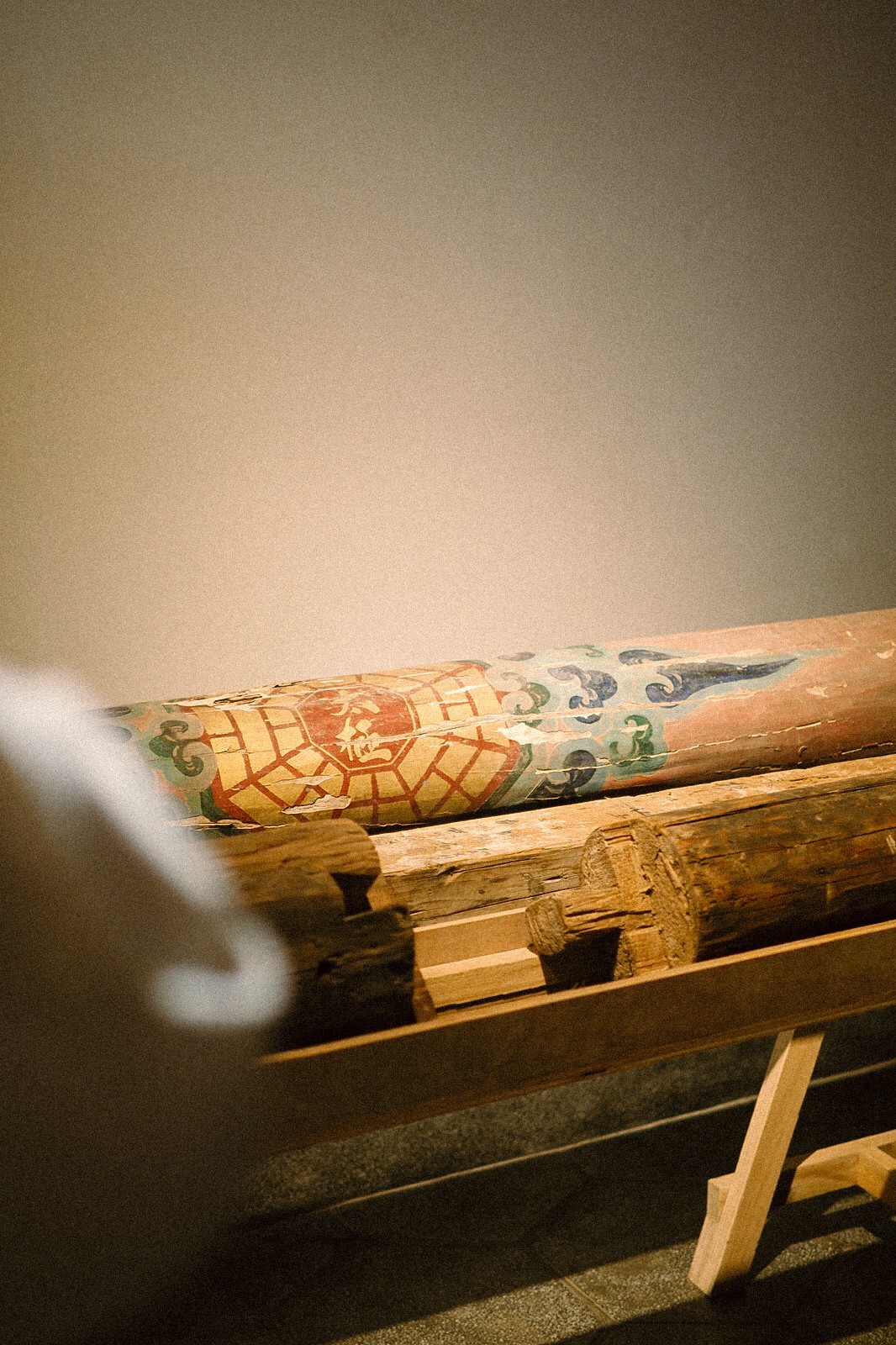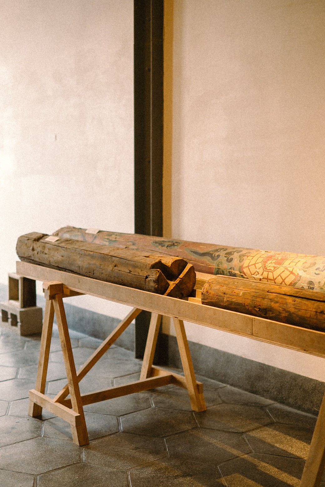 此區展出修復前保留之建材與構件樣本,記錄建築長時間使用的痕跡。斑駁的木材、帶有磨損痕跡的地磚、結構中的連接方式。例如「篙尺」為當時主持建造工程的大師所持有,為傳統木工量尺,用於測量、校準建材尺寸,確保建築構件精準對齊;「中脊」也有可觀之處,意指屋頂上居於中央最高的屋脊,是屋頂的中軸心,上面塗有彩繪為本土傳統的太極八卦圖樣,顏色則使用了少見的粉紅色。
