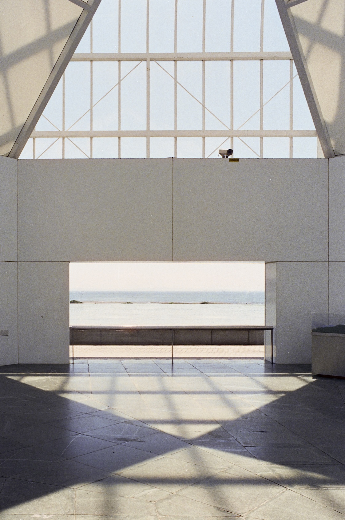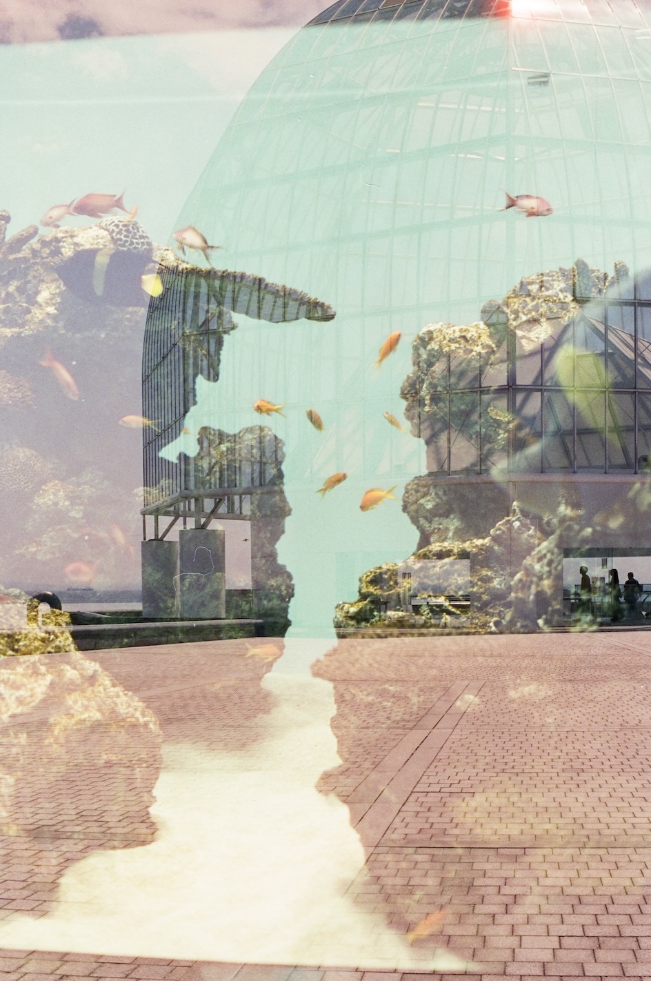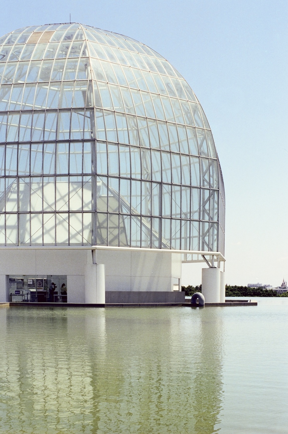 葛西臨海水族園滿足了1980 年代日本經濟高峰的城市規劃想像,一路延伸到今日仍然持續的都市更新計畫,透明外殼映照的不只是海天的分界線,也捕捉著每一個經過遊人身上帶來的當下氣息。天氣晴朗時,窗框切割的光影像是古典建築裡的彩繪玻璃,卻又帶著現代工程的冷冽精確,鋪灑在地板上形成一塊塊閃爍的碎布,令人心底油然而生一種安定的鬆弛。遠處樹叢之間,水族園的透明圓頂隱約浮現,好像另一個時空裡的信號,提醒這片土地同時蘊藏著自然與人工、歷史與當代。