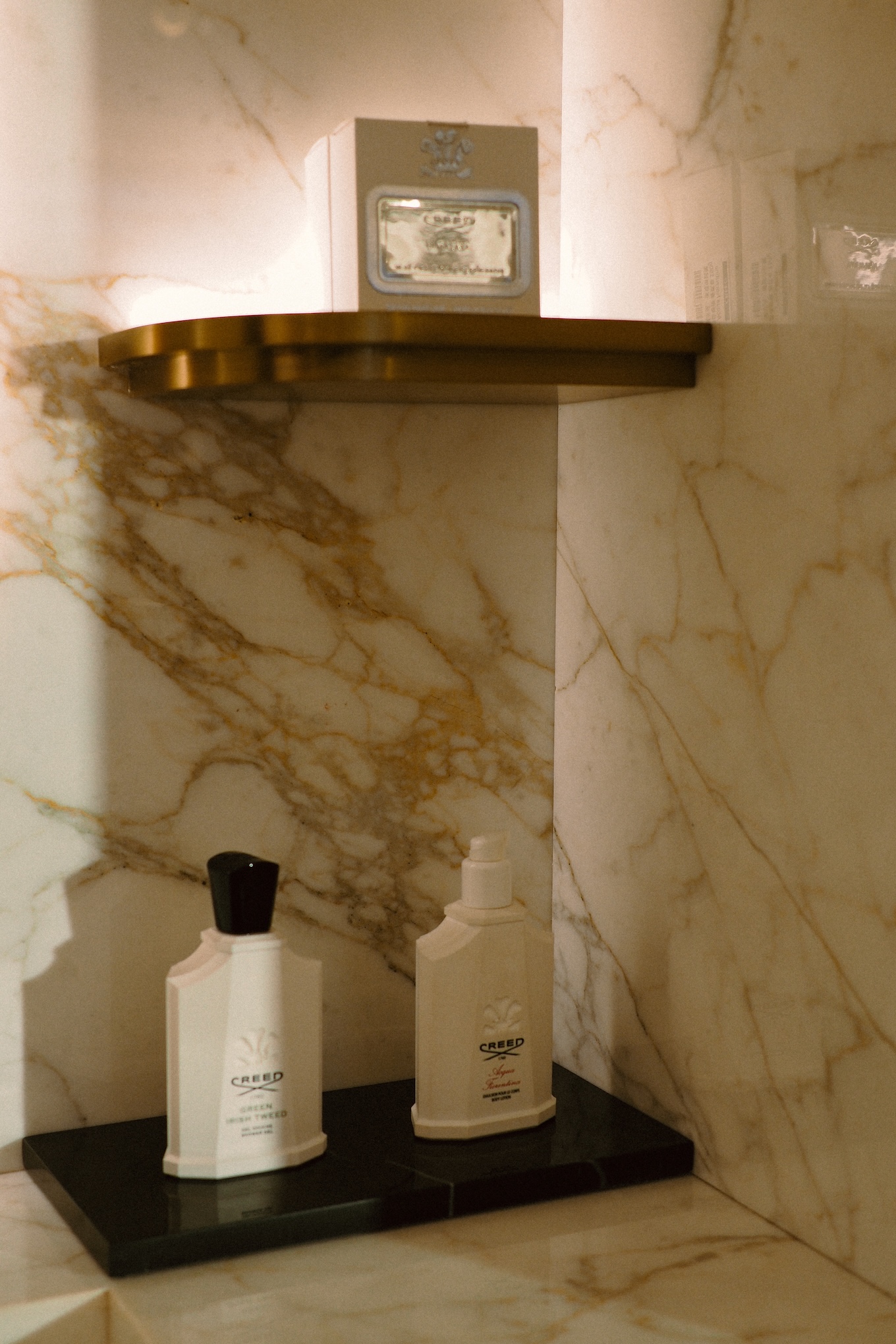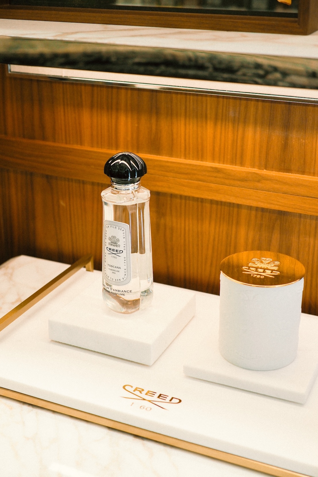 品牌在台北大安區開設的 CREED HOUSE,是首度以「House」為概念打造的街邊旗艦店。空間設計取材自歐洲宅邸格局,以義大利 Calacatta 大理石、巴西 Luana Verde 石材與黃銅、胡桃木等材質組構層次。牆面的鍍金玻璃(Verre églomisé)工藝,延伸自十八世紀法國傳統,折射柔和光澤,也暗示品牌早期的手工裁縫背景。整體氛圍在冷冽與溫潤之間取得平衡,讓香氛體驗有了觸感層次。