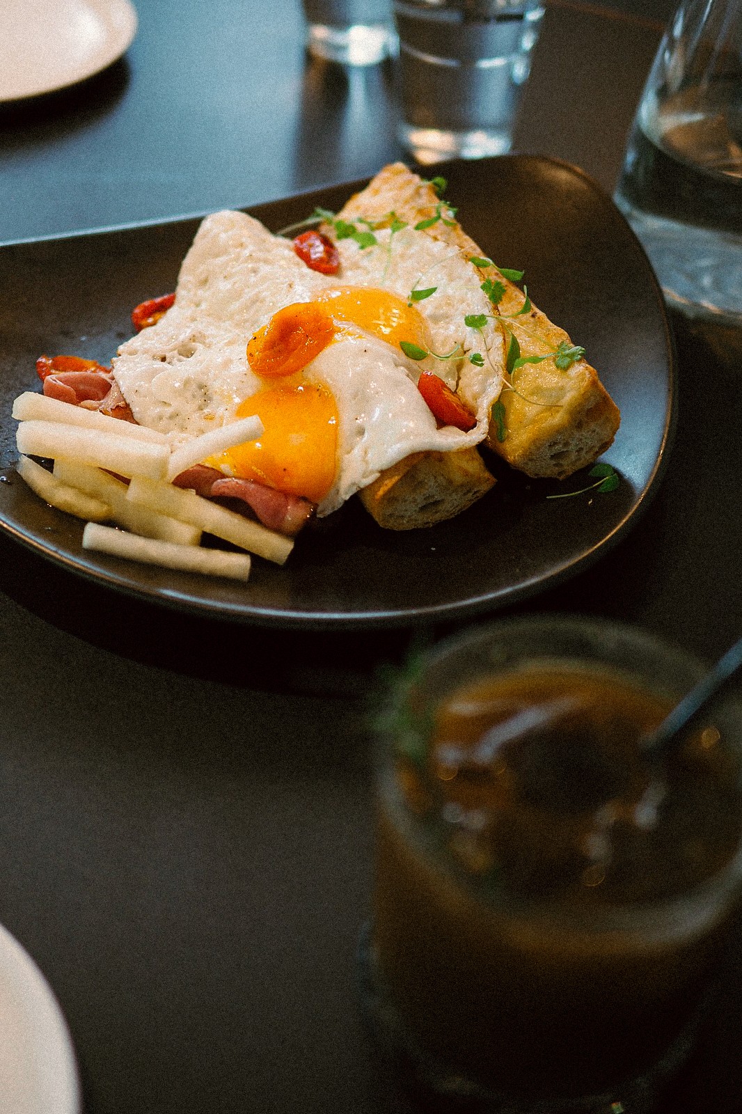 在濃郁系料理上,Intro 將多國經典轉化為更具個性與節奏感的料理樣貌。法國經典熱三明治庫克太太以開放式呈現,煙燻切達起司白醬、胡桃木火腿與流心太陽蛋交疊出歐陸早午餐的熟悉感,卻加入金桔與話梅醃漬的球莖甘藍,取得濃郁與清爽的平衡。