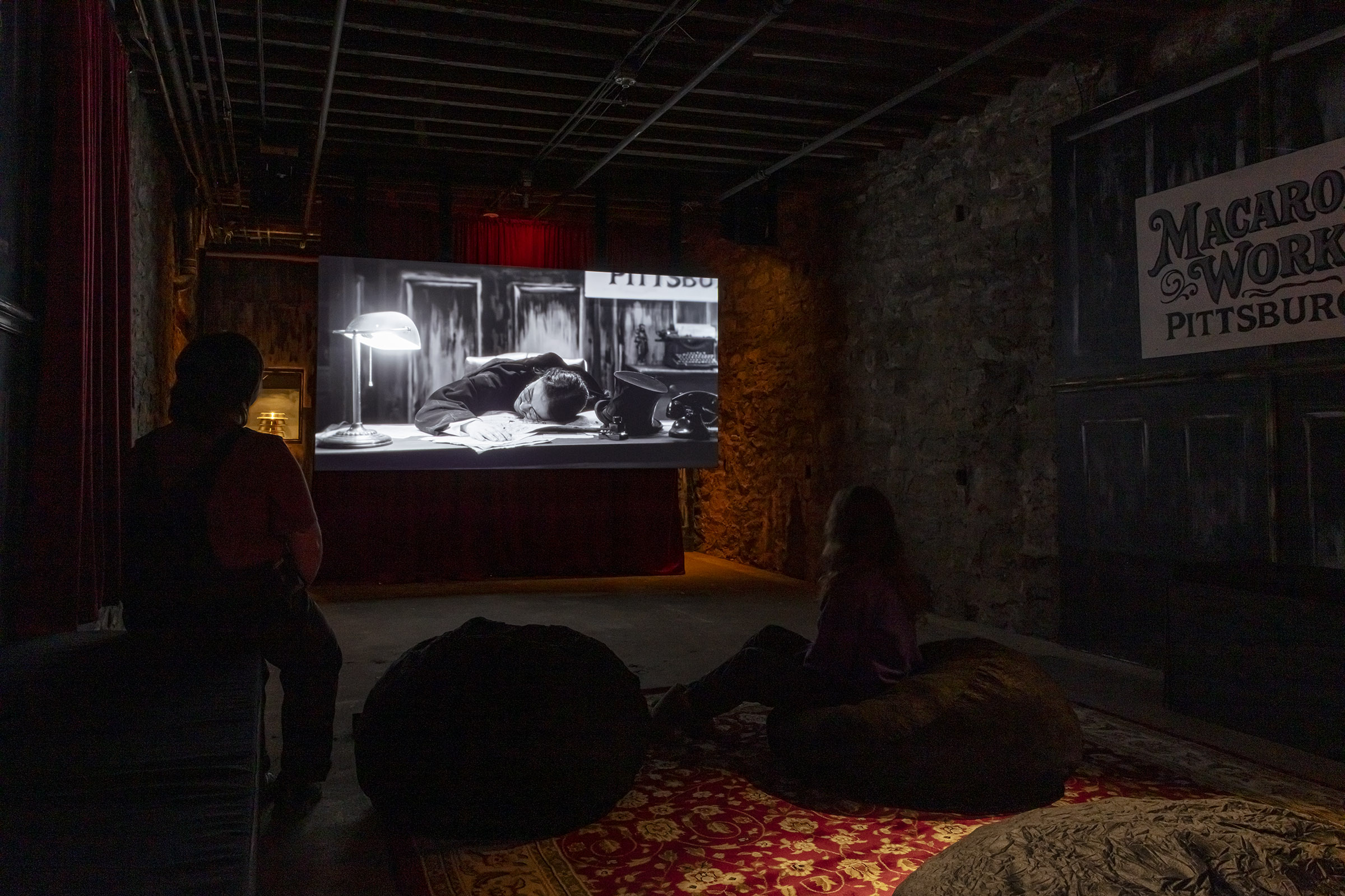 這場工人與亨利・克雷・弗里克(Henry Clay Frick)所雇用的平克頓偵探之間的暴力衝突,凸顯出當時勞資之間的權力失衡。他從這段歷史汲取靈感,並融合床墊工廠美術館自身工業與文化生產交疊的歷史脈絡,與在地電影創作者 Alex Abrahams 與 Benny Shaffer 合作,發展出一個多重線索交織的敘事,最終虛構出一部通心粉工廠內的謀殺懸疑片。
