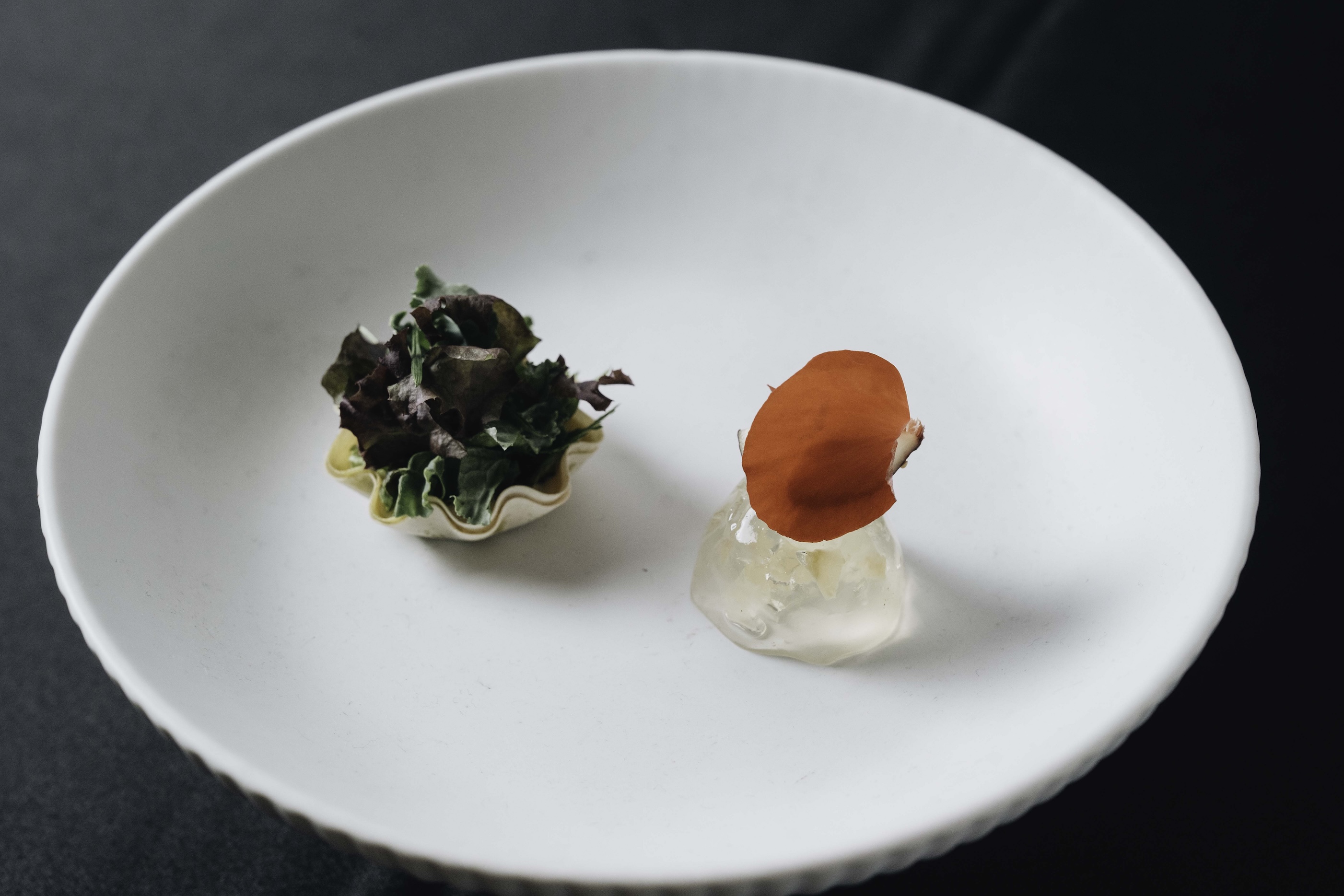 在料理共創過程中,四位綠星主廚掌握了精準的食材個性與風土脈絡。好嶼 HOSU 主廚李易晏,以一系列看似輕巧但結構縝密的前菜開場,以「路葡萄酒莊」的白葡萄酒「春之繽紛」所製成的「路葡萄酒凍」,把直接飲用時感受到的蜂蜜香、酸度與葡萄果香拆解重組,轉化為晶透的酒凍層次;「綜合生菜小塔」使用番挖水耕農場的各式蔬果,製作小巧精緻的塔殼,承接農場的芝麻葉與山蘿蔔葉所製成的芝麻葉青醬。搭配上羽衣甘藍、蝦夷蔥、紅羅曼、綠奶油、紅卷葉等多種葉菜的清甜與脆度,再疊上乳酪香、堅果香與油脂,讓一口之中同時感受到香草氣息、脂香與生菜的清爽。