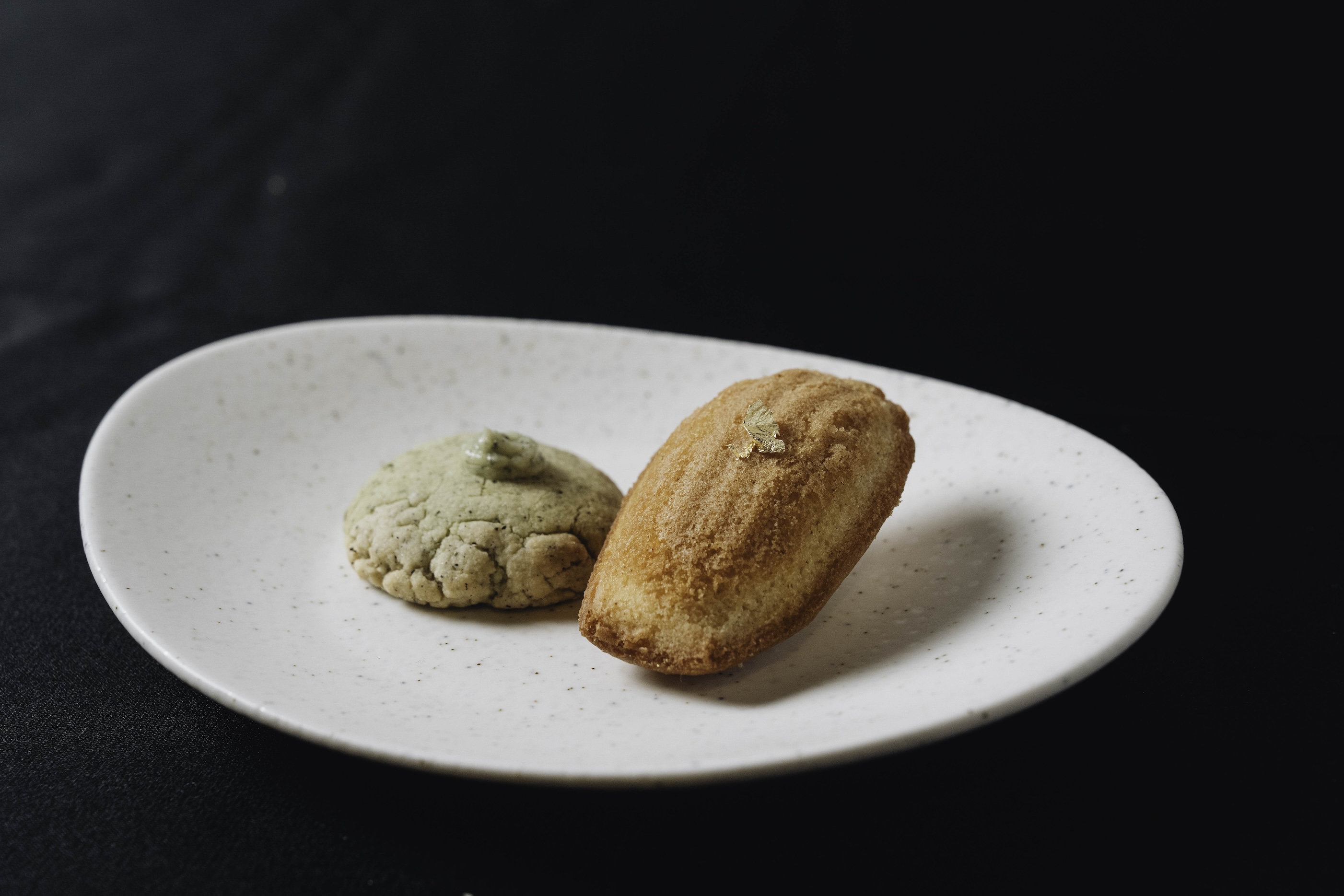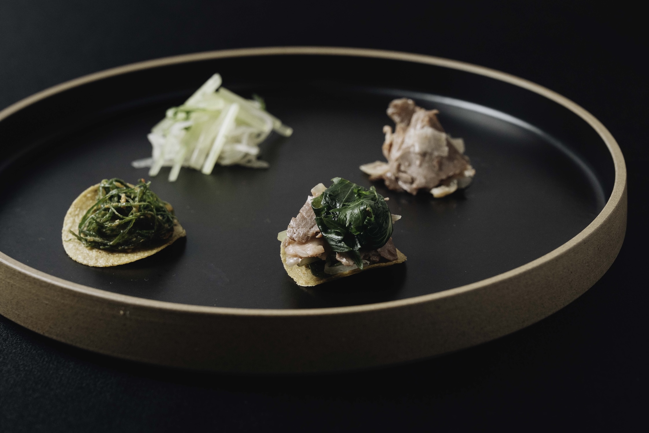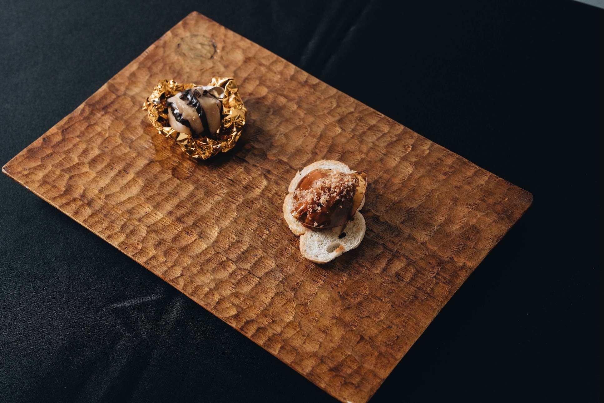 小小樹食行政主廚徐兆麟,則從植物性飲食與永續視角出發,提出兩款風味截然不同、卻同樣能呈現食材特性的創作。「黑后金莎」取材自上安農場的有機乾香菇,以其純淨而濃郁的木質調香氣為主體,結合咖啡豆碎,翻轉金莎巧克力的概念,以菇、咖啡與乳脂延伸出另一種深邃而成熟的層次;另一款「初釀醬油凍與醋漬無花果」以生火腿麵包為靈感,將新和春原味初釀醬油做成透明晶凍,模擬生火腿的鹹鮮與油脂感,再以檸檬濃糖濃果漿調製的酸度與無花果的果香相互映襯。