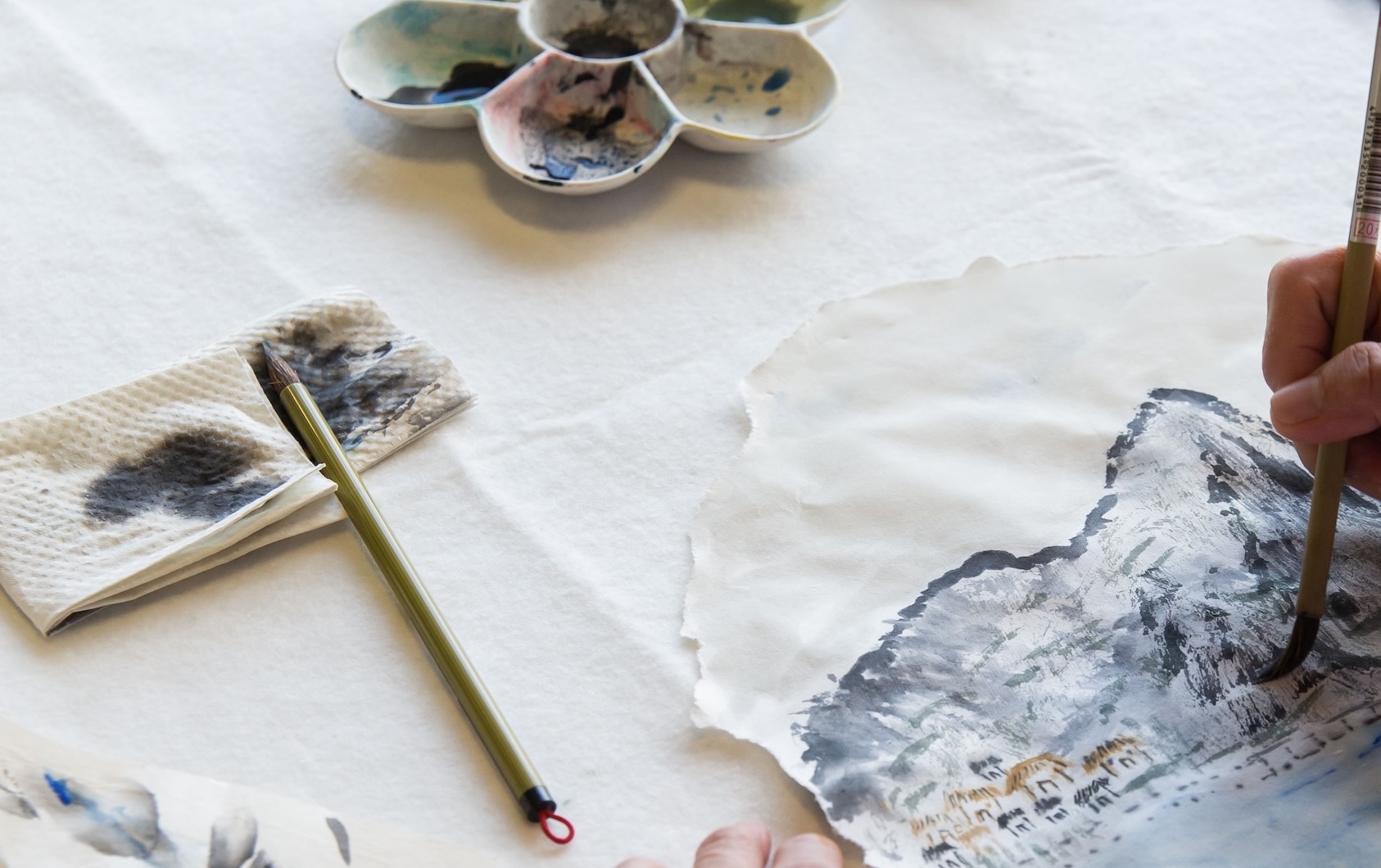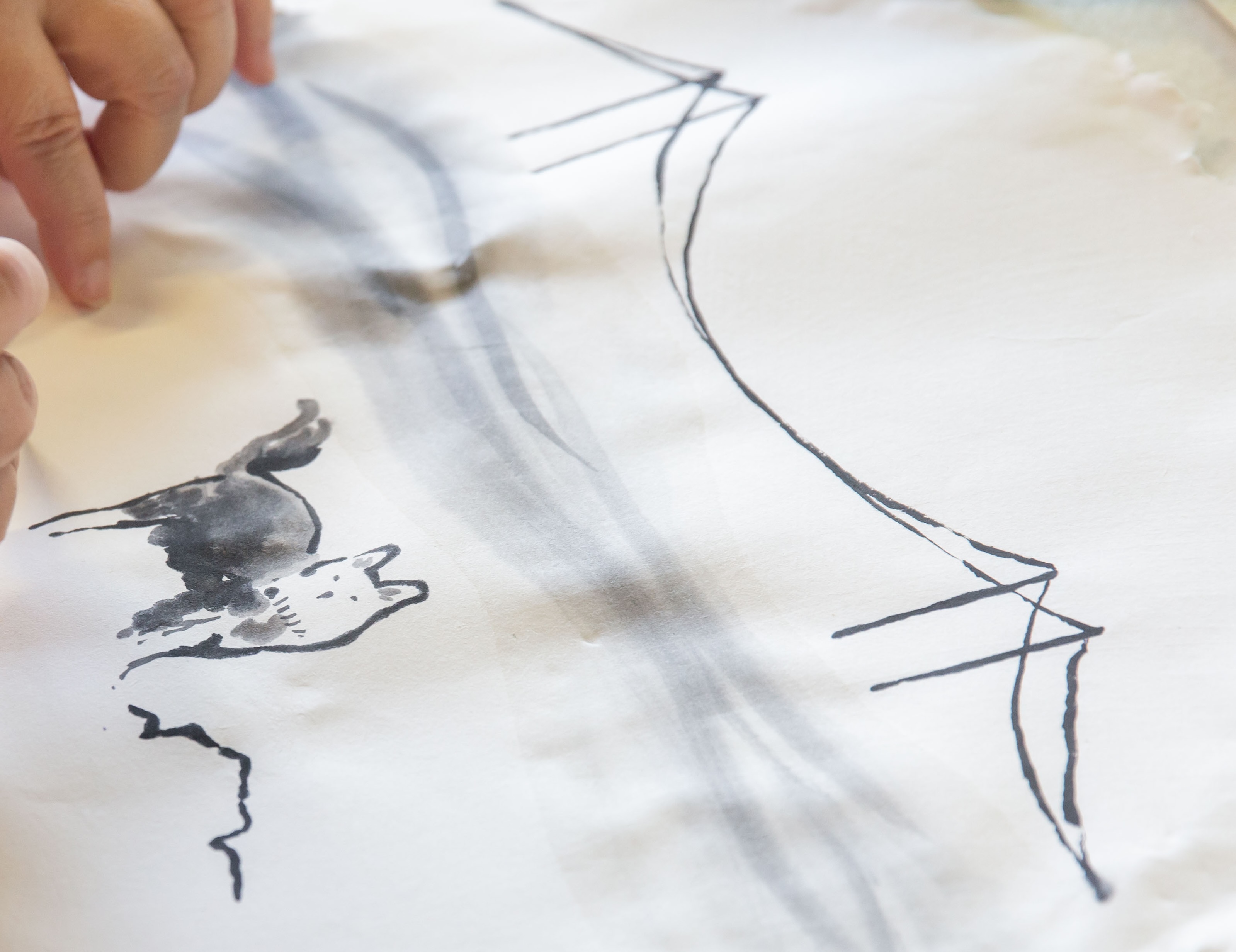 凝縮不同時空背景、新舊文化及生活樣態,「街事美術館:遊山玩水」也攜手水墨藝術家高安柏與劇場設計師林昭安,與總計17位社區夥伴合作,由「在水的另一方:當代水墨繪寫」和「我在山裡,晚點到 文本x物件x材質-劇場設計」兩大主題工作坊,將住民對於山林中、兒時悠遊於基隆廢河道等過往、記憶做為作品出發點,延伸至最終兩件現地藝術創作;展場動線上透過錯落的路徑,引領觀者沿著北藝中心內部的天橋和坡道行進,穿梭於逐級攀升下降的動線之中,彷彿在立體展開的山水地形中漫步。