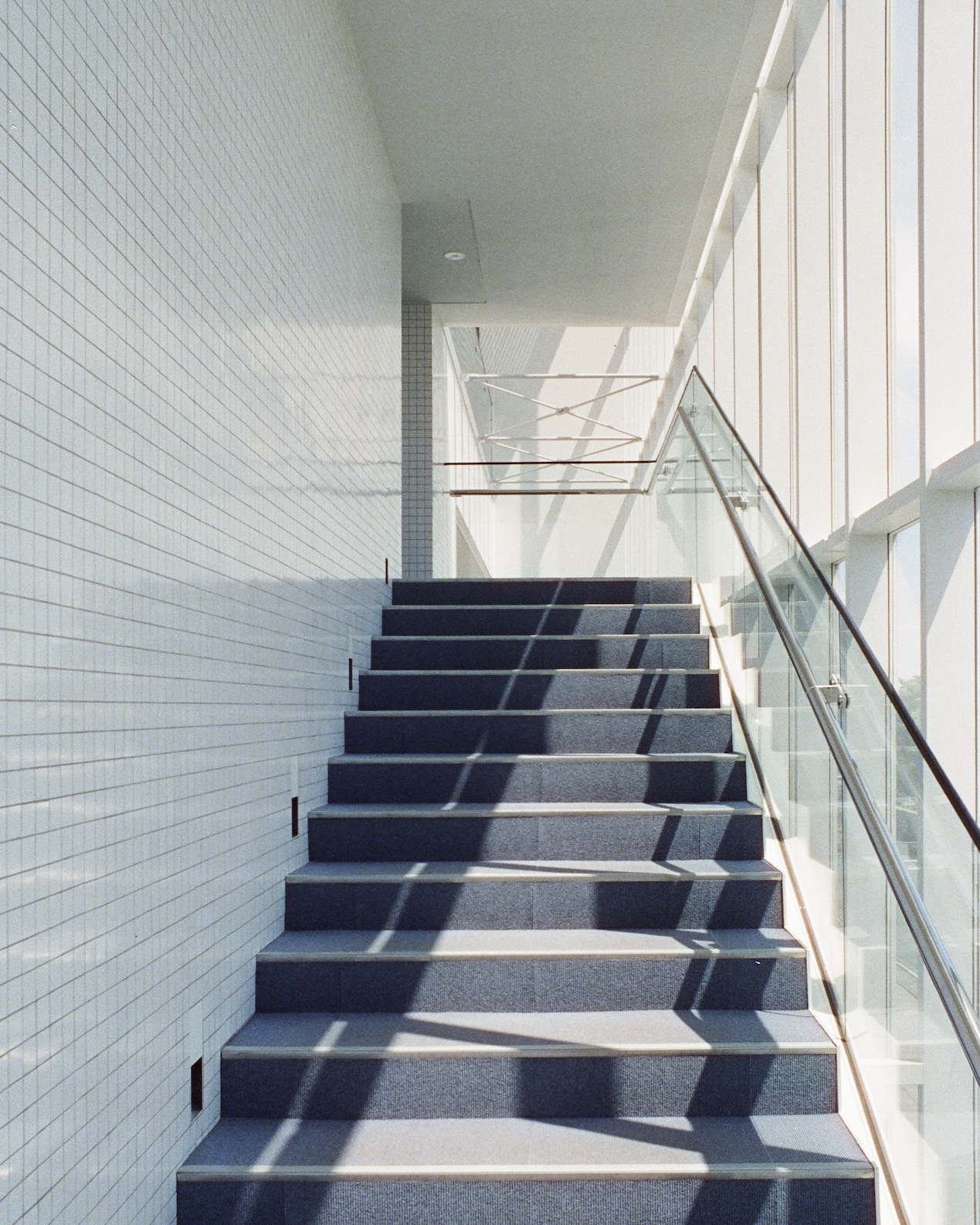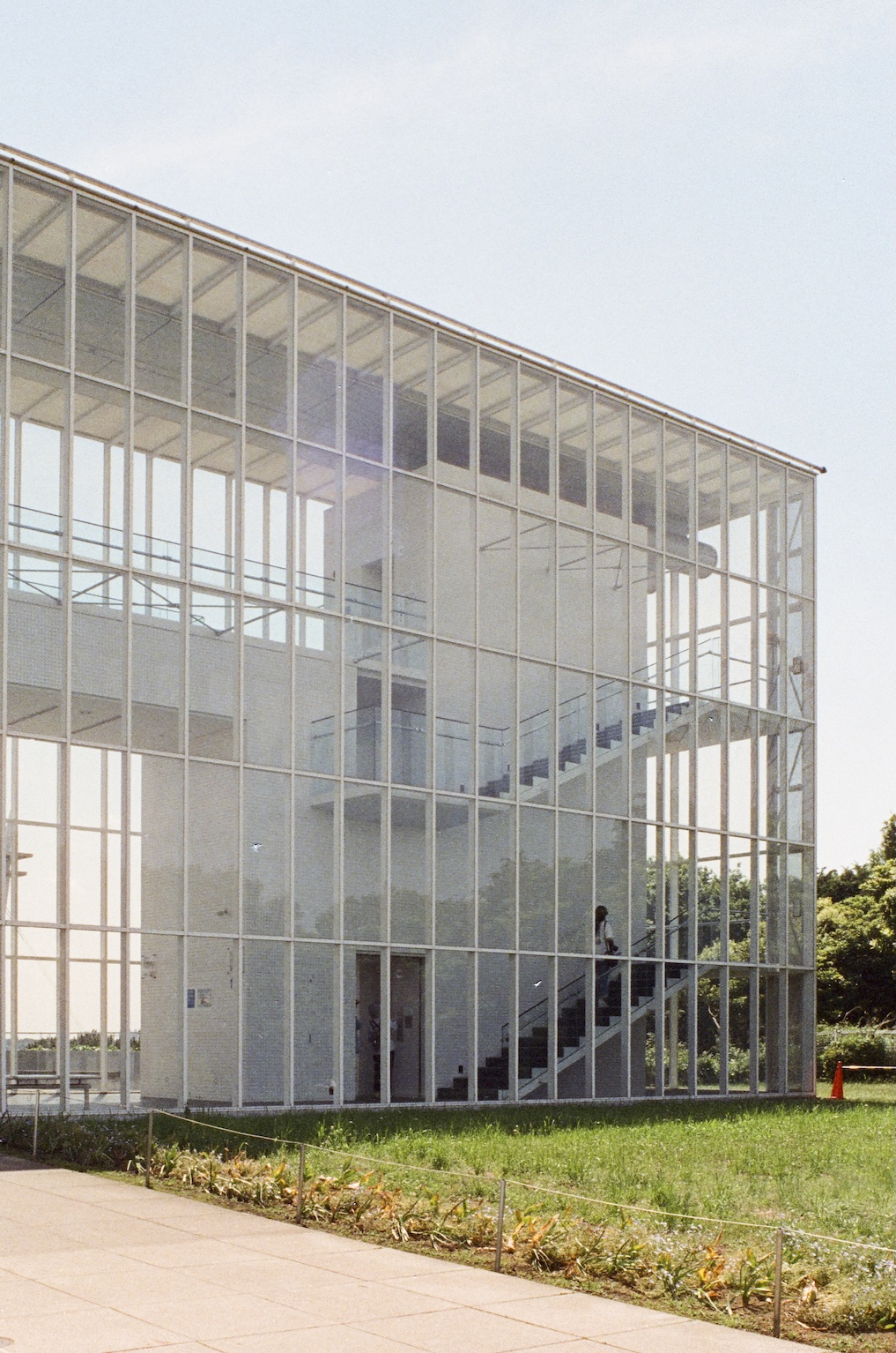 穿越葛西臨海公園的廣場,腳步若是選擇直行,就會在不知不覺中抵達觀景台。那是一個長方形量體的透明盒子,內部設計讓人可以任意挑選上升的方式,透過樓梯、電梯,或是一條緩慢傾斜的長坡。而當身體隨著緩坡一寸寸往上,眼前的景象也隨之轉換,地平線漸漸抬升到與海平面重疊,彷彿整座城市暫時退到遠方,只留下東京灣沿岸的浩瀚藍色作為視野的唯一主角。
