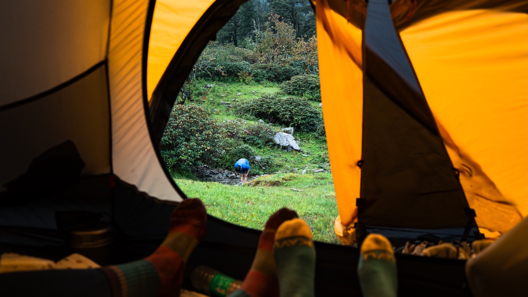 有驢隊的好處是五星級的營地體驗,連如廁都有專用帳篷,在台灣高山可是要光著屁股給水鹿看的。隨行廚師 Babloo 總是能變出多種菜色,連咖哩口味都有變化。在廚房帳看著他靦腆地料理、交流台灣的美食,是每天一大樂趣。Masala 是一種香料搭配概念,添加蜂蜜、薑末或不同食材,讓奶茶風味各樹一格。Lassi 喝起來像是保久酸奶,發音跟效果有異曲同工之妙。Dosa 是一種像煎餅果子的食物,餅皮香脆,裡頭包裹蛋和配料。「思哇底斯」是他教大家的第一個印度單詞,表示「美味」,也許是希望我們多給他情緒價值。眾人在客廳帳唱歌、玩遊戲,沒訊號的日子,笑聲更多了。
