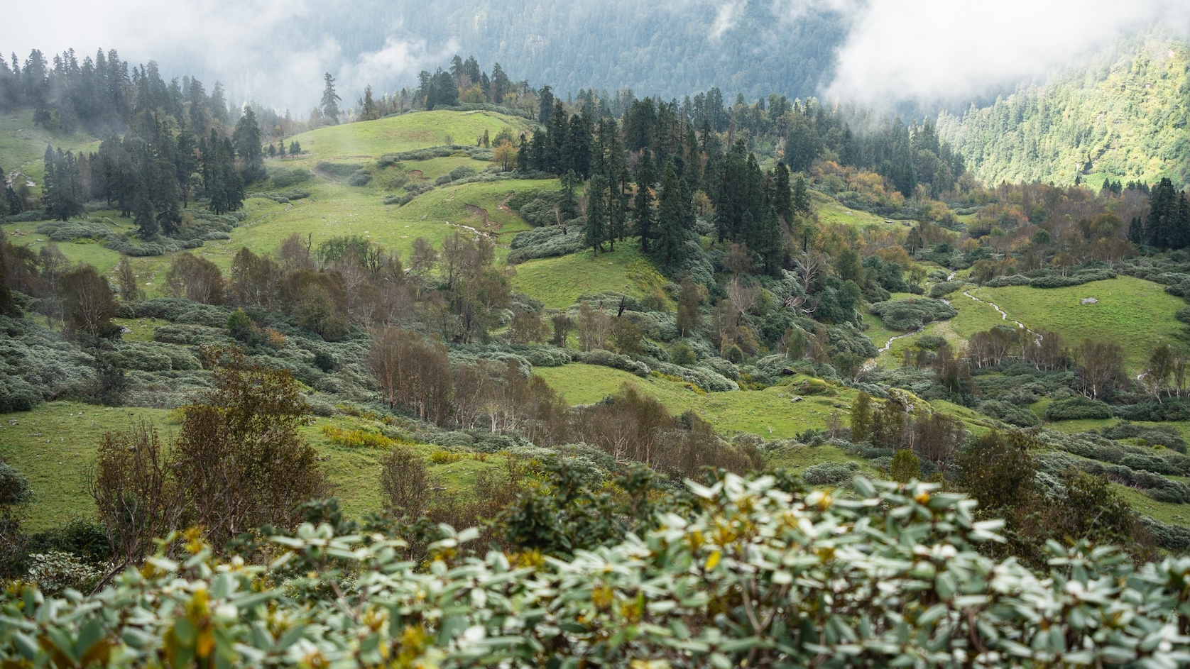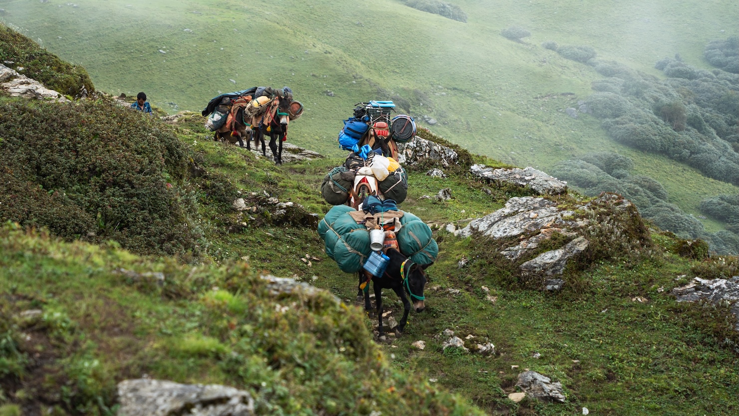 四日的健行路線飽覽森林、草原、谷地、湖泊、雪山與牧羊文化。沿途碎石閃耀著銀色礦澤,白、黃、粉、紫的花朵點綴著植被。男嚮導 Sono 偶爾會收集一束送給女嚮導 Sami,嗑這對「CP」是我們休息時的娛樂。牧羊人用石板砌成屋子,只有一廳——廚房、臥室、客廳,那是他們整個夏天的家。層巒疊嶂的岩峰像魔戒第二集洛汗國出現座狼的場景,羊、牛、馬、驢不時出現在林間,而我總期待著瞥見老虎的斑紋。