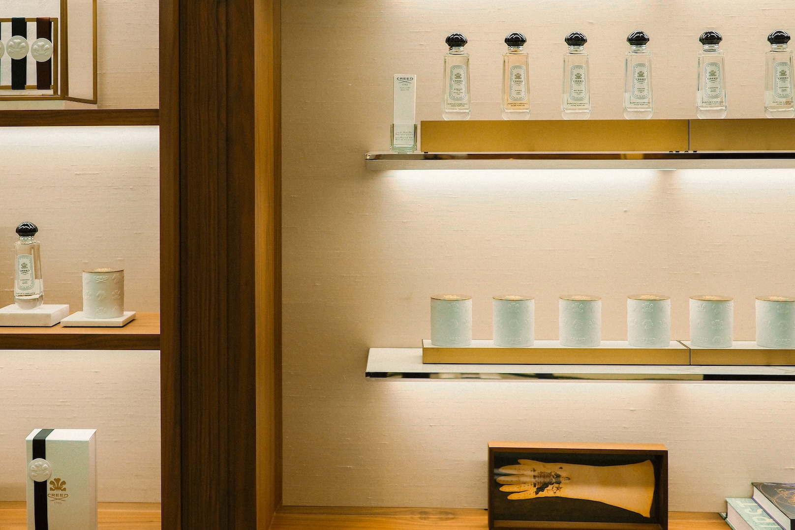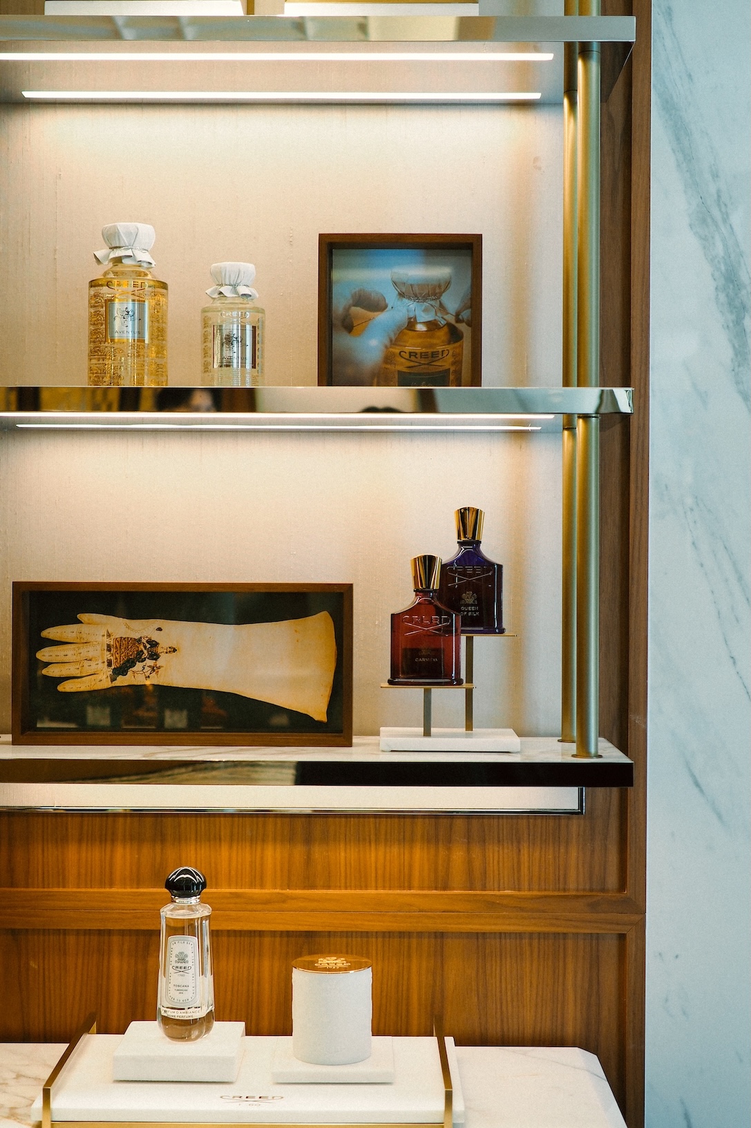 品牌在台北大安區開設的 CREED HOUSE,是首度以「House」為概念打造的街邊旗艦店。空間設計取材自歐洲宅邸格局,以義大利 Calacatta 大理石、巴西 Luana Verde 石材與黃銅、胡桃木等材質組構層次。牆面的鍍金玻璃(Verre églomisé)工藝,延伸自十八世紀法國傳統,折射柔和光澤,也暗示品牌早期的手工裁縫背景。整體氛圍在冷冽與溫潤之間取得平衡,讓香氛體驗有了觸感層次。