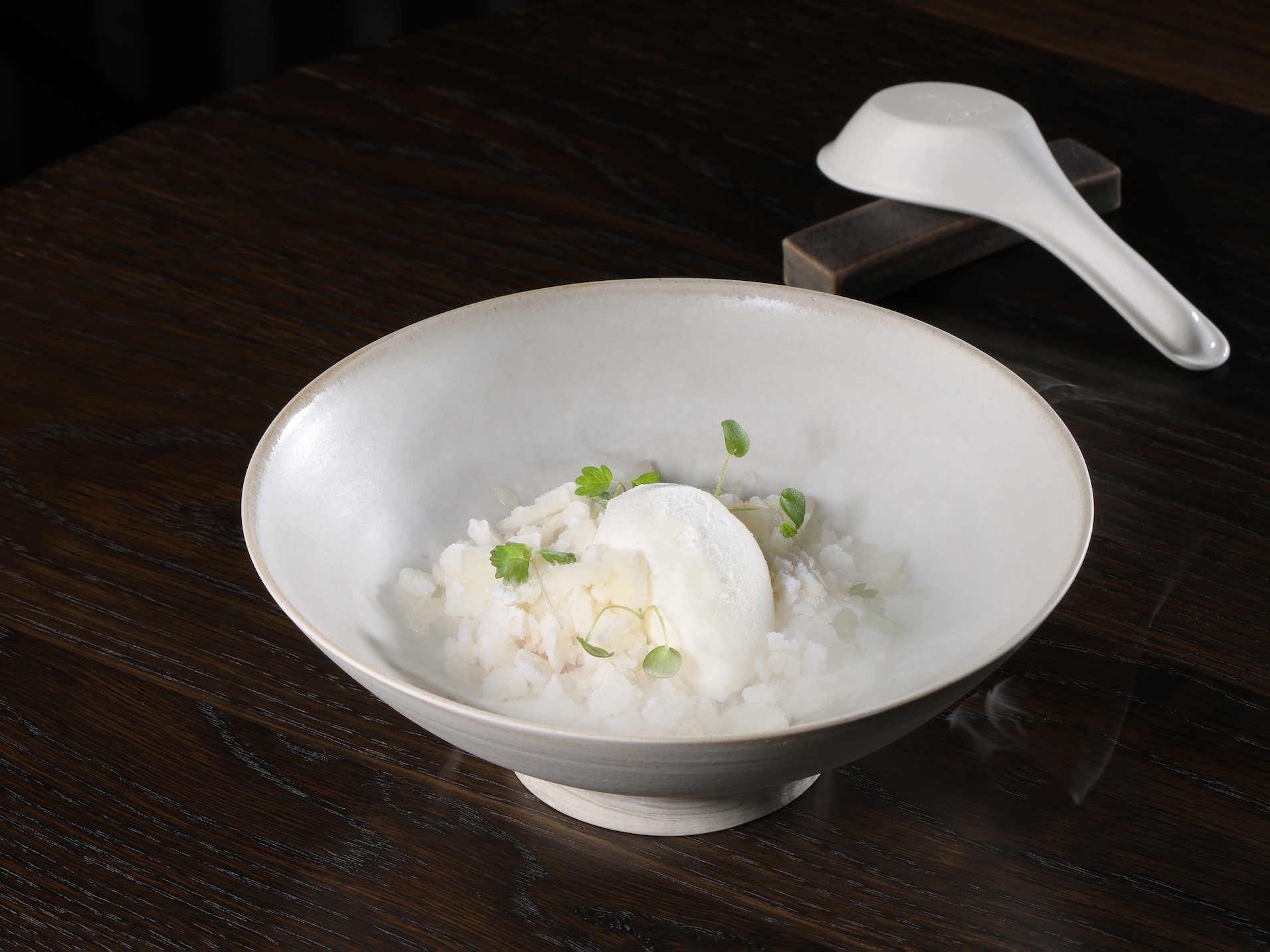 前兩道料理圍繞酸度與鮮味,軟絲手捲由炭烤鹽麴軟絲與烤大蘆筍呈現,秋葵烘製成薄片增加口感,自釀的芒果青提供亮酸。搭配酒的果酸與木質氣息維持清楚界線,與海鮮與青蔬的鮮甜並行。第二道以山藥與卡門培爾乳酪為主角,發酵與乳脂形成厚度,表面刷自製無花果辣豆瓣。配件為醃漬無花果與新鮮栗子,香菜苗作為視覺與清香補強。酒的酸度在這裡呈現收斂狀態,花蜜氣味靠近乳酪的濃度,使整體更集中。