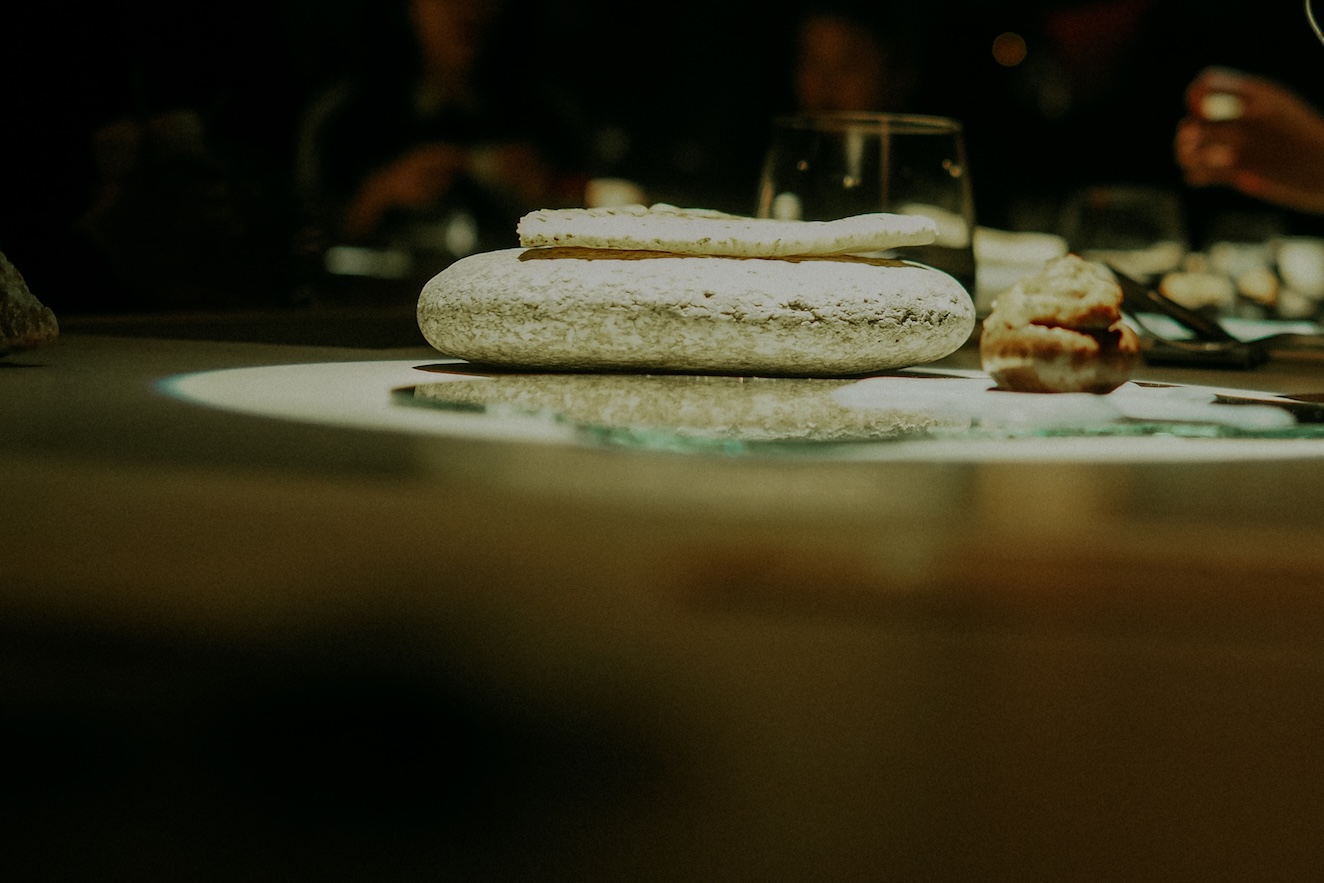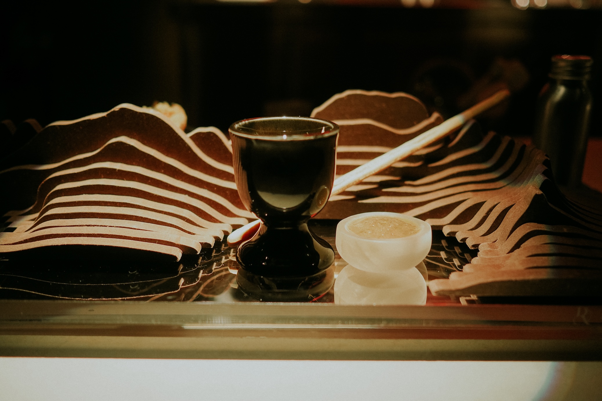 器皿的木質底座是沙丘的起伏與旅途的痕跡;縫隙間的黑色與鏡面,象徵地景的裂痕與海市蜃樓,暗示旅途中的不確定與幻象。盤上散落的幾何體,如同市集的帳篷與攤販,也對應每一道小食的意涵與精神。