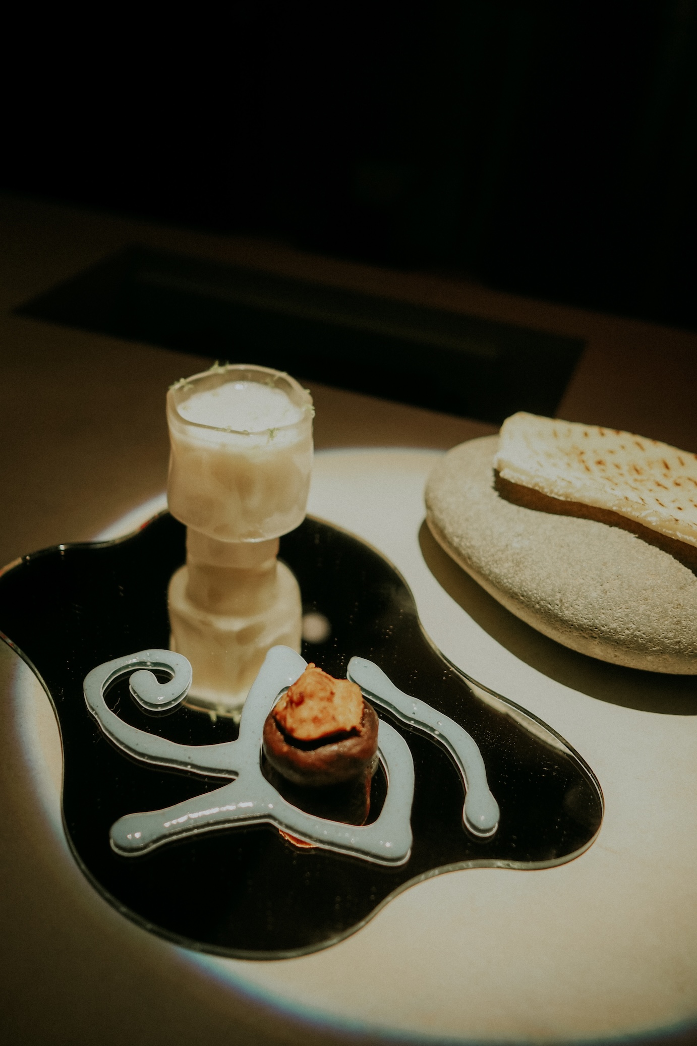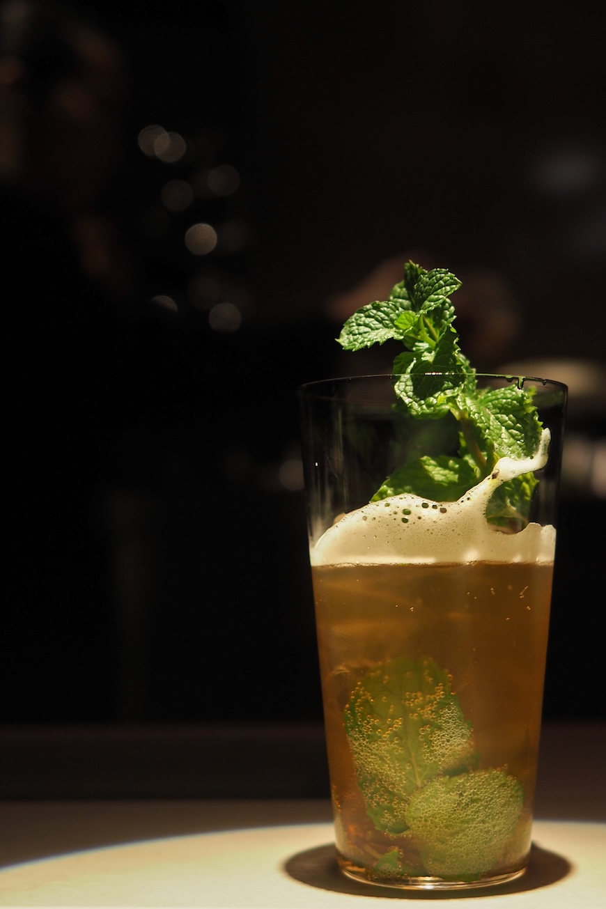 啟程前,每位旅人會先獲得一杯沁涼的 Mint Julep,以被稱為柏柏爾威士忌的無酒精摩洛哥茶 (Atay b’ Naanaa) 為架構作改編,將綠茶與糖置換成波本威士忌、黑糖與台灣的炭焙烏龍茶,並加入冰塊。在摩洛哥當地這款茶代表尊重和好客,於此同樣對參與的旅人展現歡迎,開啟套餐與味蕾上的探險,也為接下來的「破界」與「融合」奠定基調。