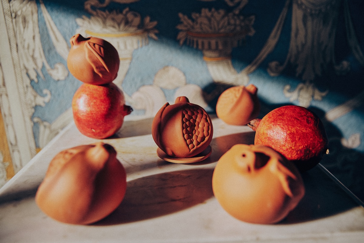 完美復刻石榴飽滿圓潤的姿態,呼應農曆新年對於 「圓滿」與「豐收」的美好嚮往。果實之中,晶瑩如紅寶石般的籽粒,自古即象徵家族延續與生命繁盛,寓意深遠而雋永。