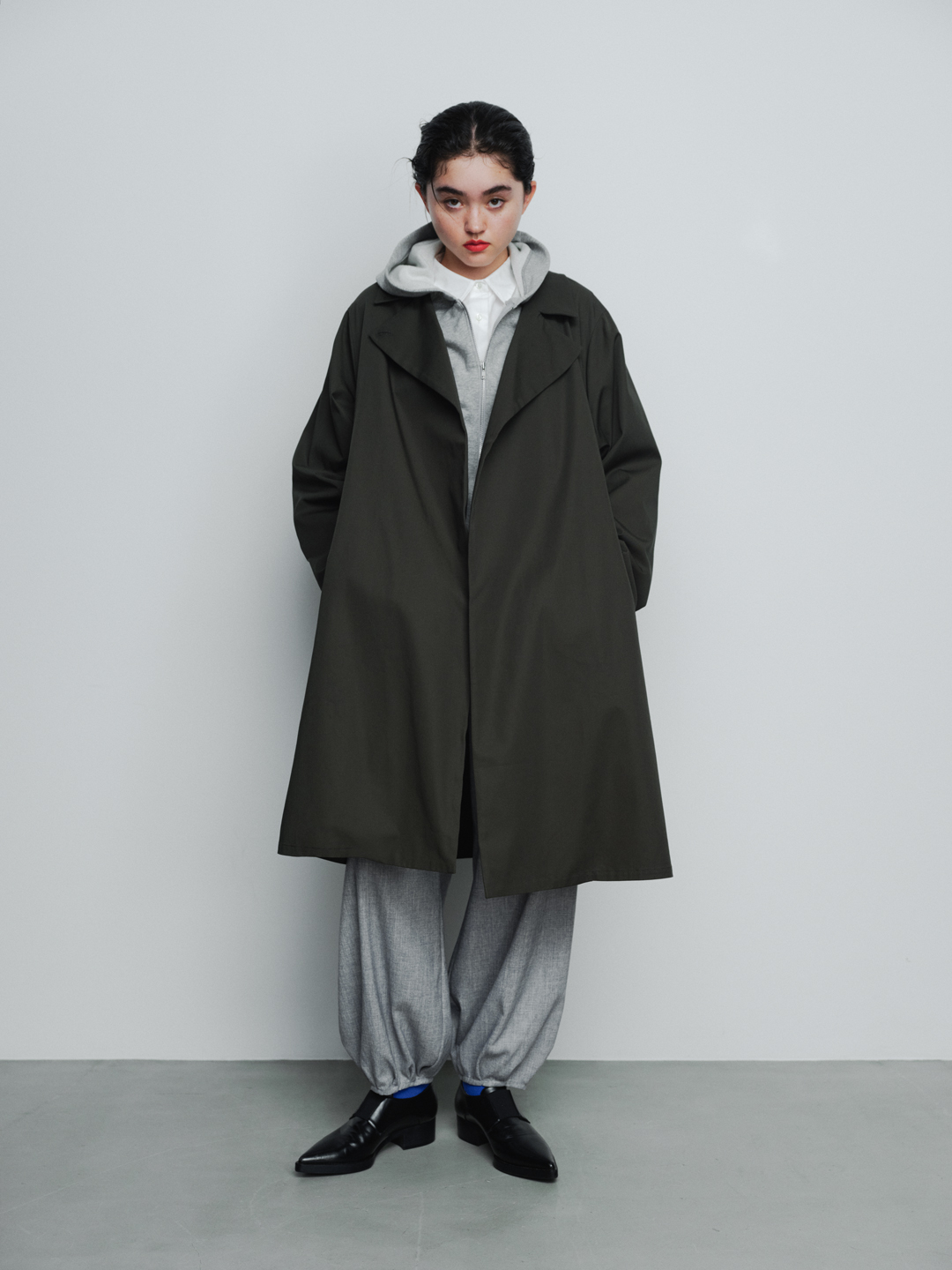 而 Trench Like CT 長版風衣外套,以經典風衣為基礎,極力簡化裝飾元素,材質選用挺度適中的棉質斜紋布。設計上運用圓弧造型的領片增添柔和的女性氣息,透過自然向外延展的傘狀剪裁,營造出俐落線條、帶有空氣感的造型。