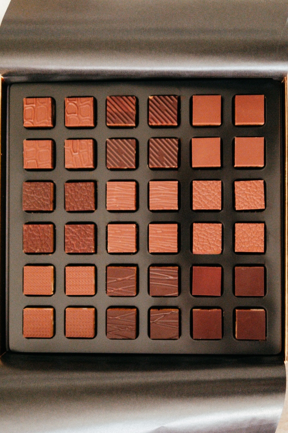禮盒內共收納 9 款巧克力作品,從堅果到咖啡、從香料到焦糖依序展開。以越南腰果製成的甜夾心巧克力作為入口,質地柔滑,甜味清楚;皮埃蒙特榛果與可可碎粒的組合帶出較深的可可感受。