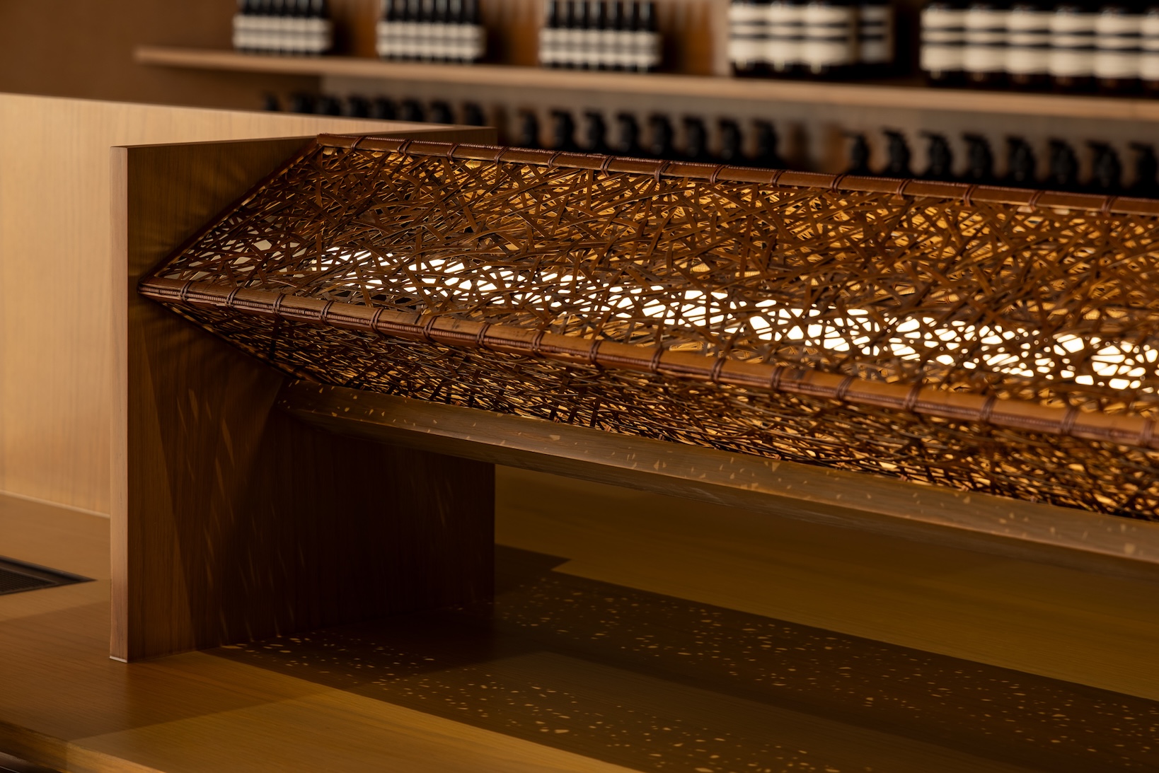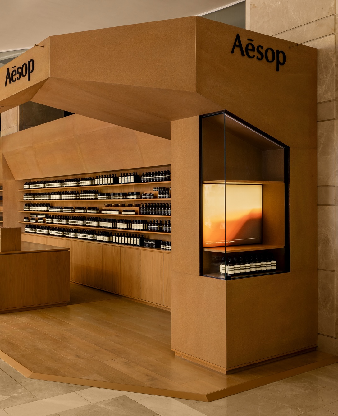 設計手法受粗獷主義(Brutalist)影響,但又與之有所偏離,減弱了粗獷主義代表性的冷硬的混凝土與玻璃,轉換為 Aesop 更具溫度手感的自然有機材質呈現。整體空間保留大自然雕刻型態的最初概念,塑造出錯落有致的秩序感,注重空間的實用性與結構型態,呈現出巨大、不特別經過修飾的角形結構,以其大地色調作為包覆此空間的外殼,賦予其內斂而均勻的視覺感受。